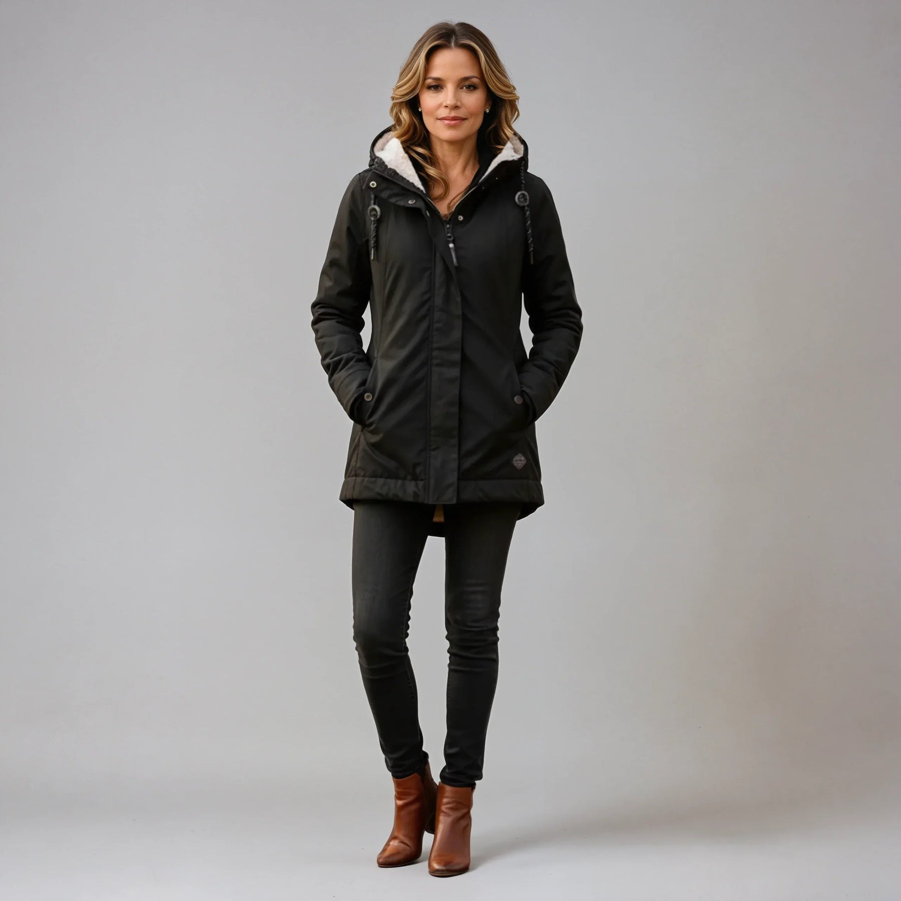 Írunn-jakkinn sameinar það besta úr báðum heimum. Hann er vatnsheldur, með mjúku innra lagi og með hagnýtri húfu sem ver gegn vindi og rigningu. Þökk sé löngum sniði heldur hann ykkur hlýjum og þægilegum á meðan þið litið stílhreint út.