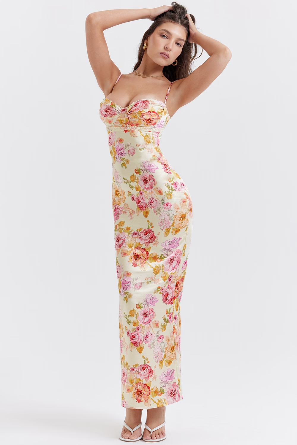 Axlarlaus glæsileiki: Kær hálsmál og felling á bringunni undirstrika axlir og viðbein með fínlegri náð.