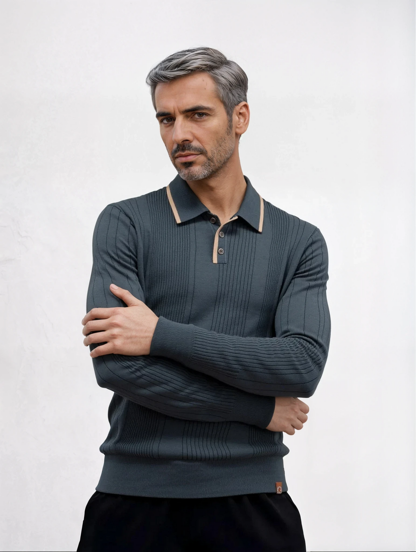 ✔ Kragi í pólóstíl með andstæðum skreytingum og hnappasköftum
