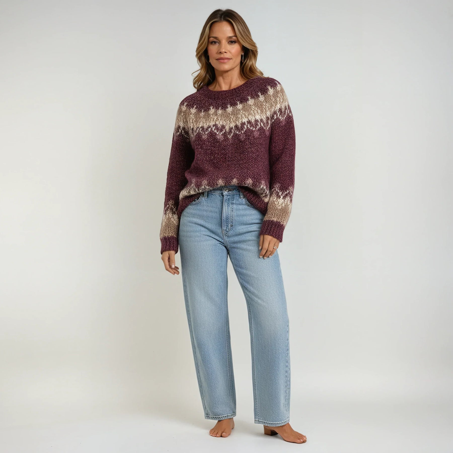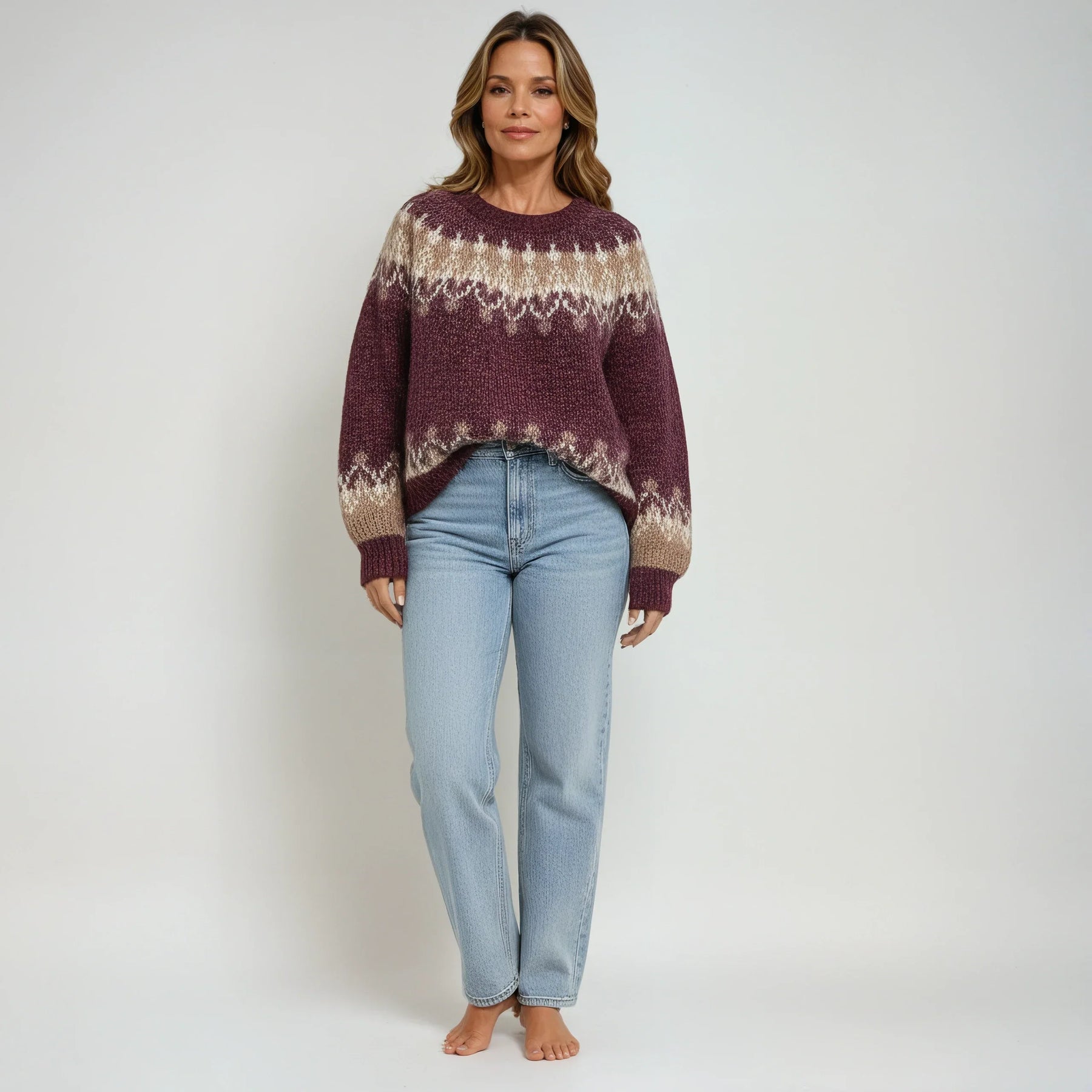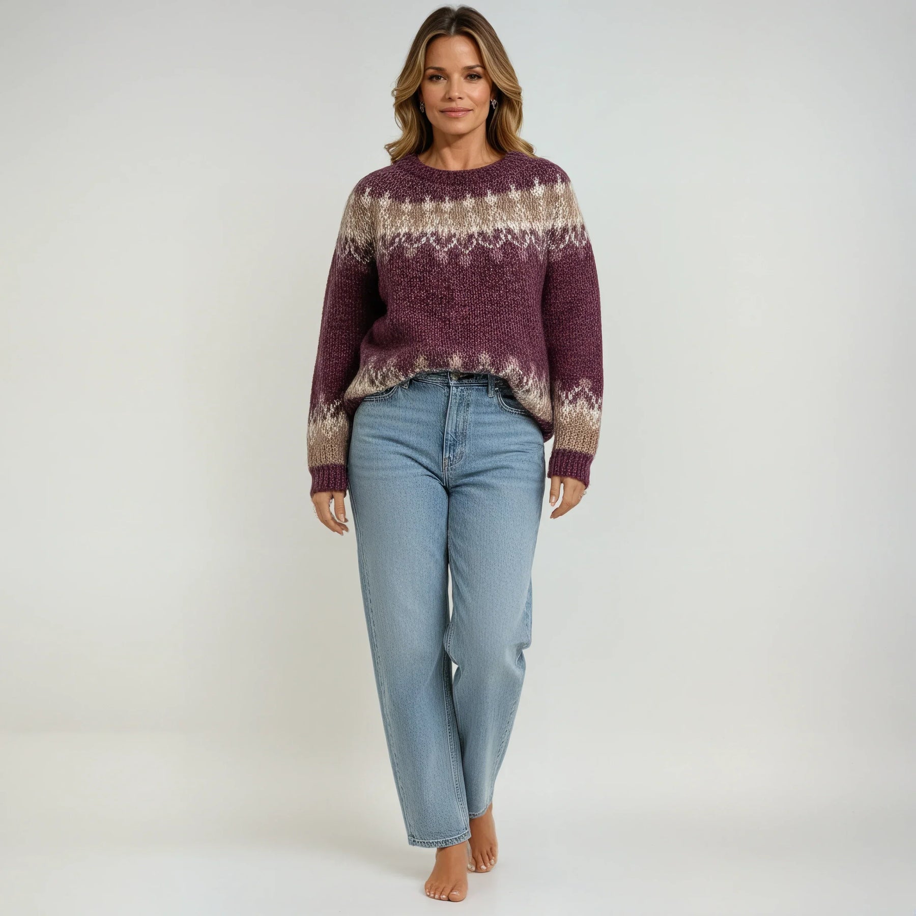 „Þessi peysa er svo hlý og mjúk og ég elska litina — þeir eru hressir en samt mildir. Sniðið er afslappað án þess að vera of vítt og hún er nógu hlý fyrir göngutúr á köldum haustdegi. Ég hef þegar fengið nokkur hrós!“