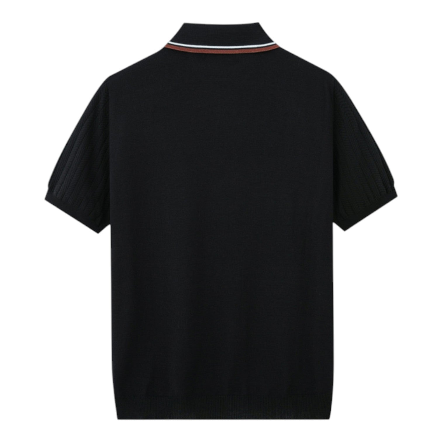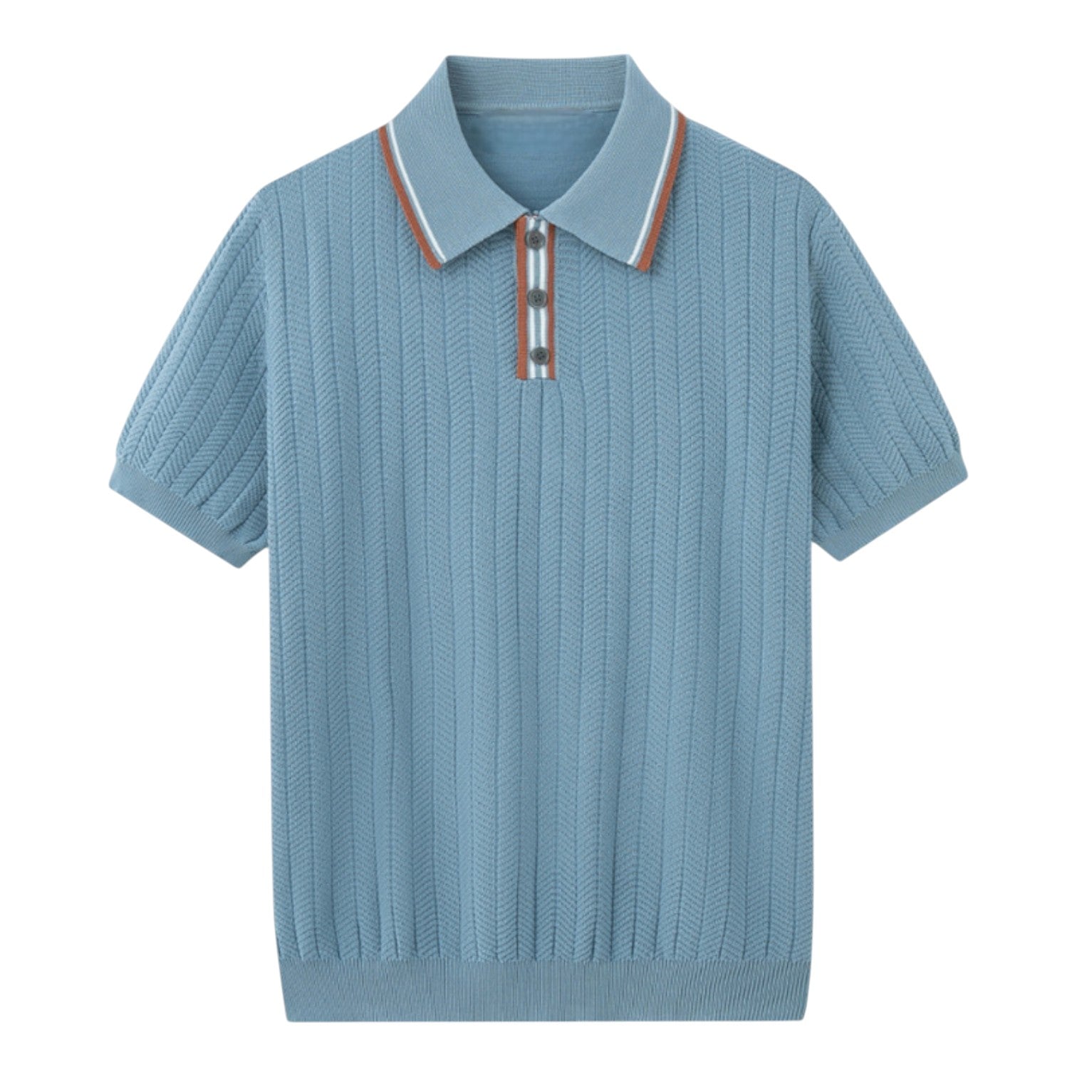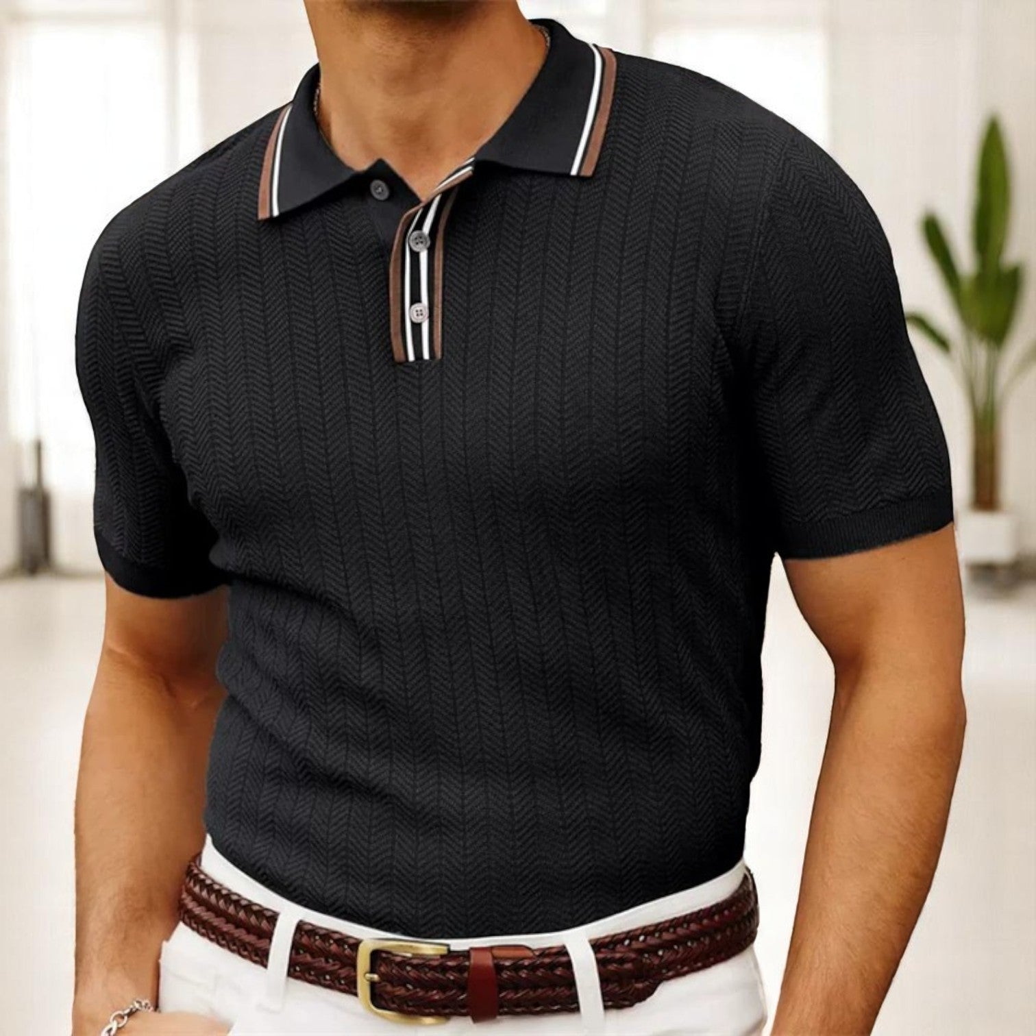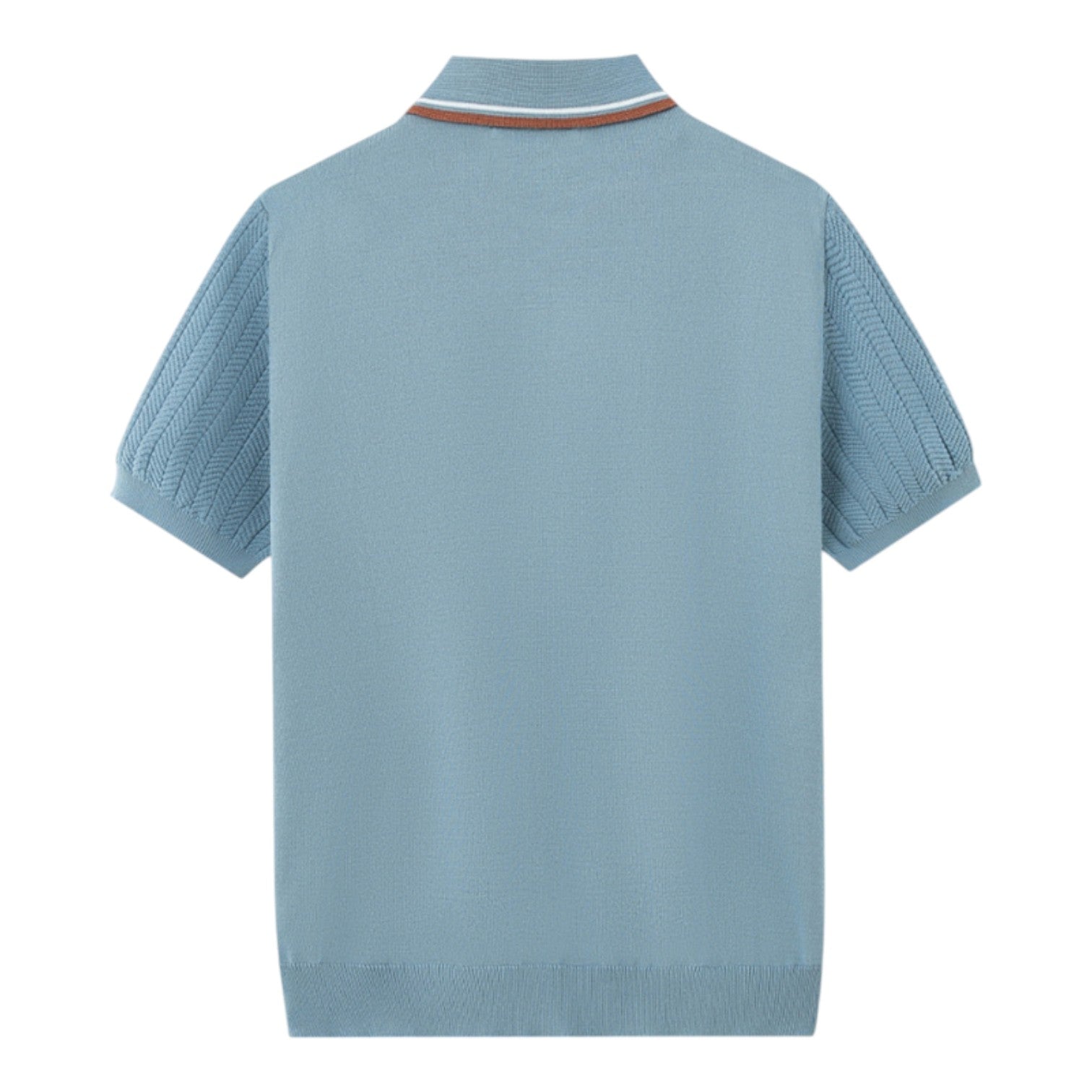Glæsileg prjónuð pólópeysa úr mjúkri viskósu með náttúrulegri teygju. Hún er með áferðarmynstri, andstæðum kraga og hreinum þriggja hnappa klaufa — fullkomin fyrir hlýja daga úti, afslappað kvöld eða hvað sem er þar á milli.