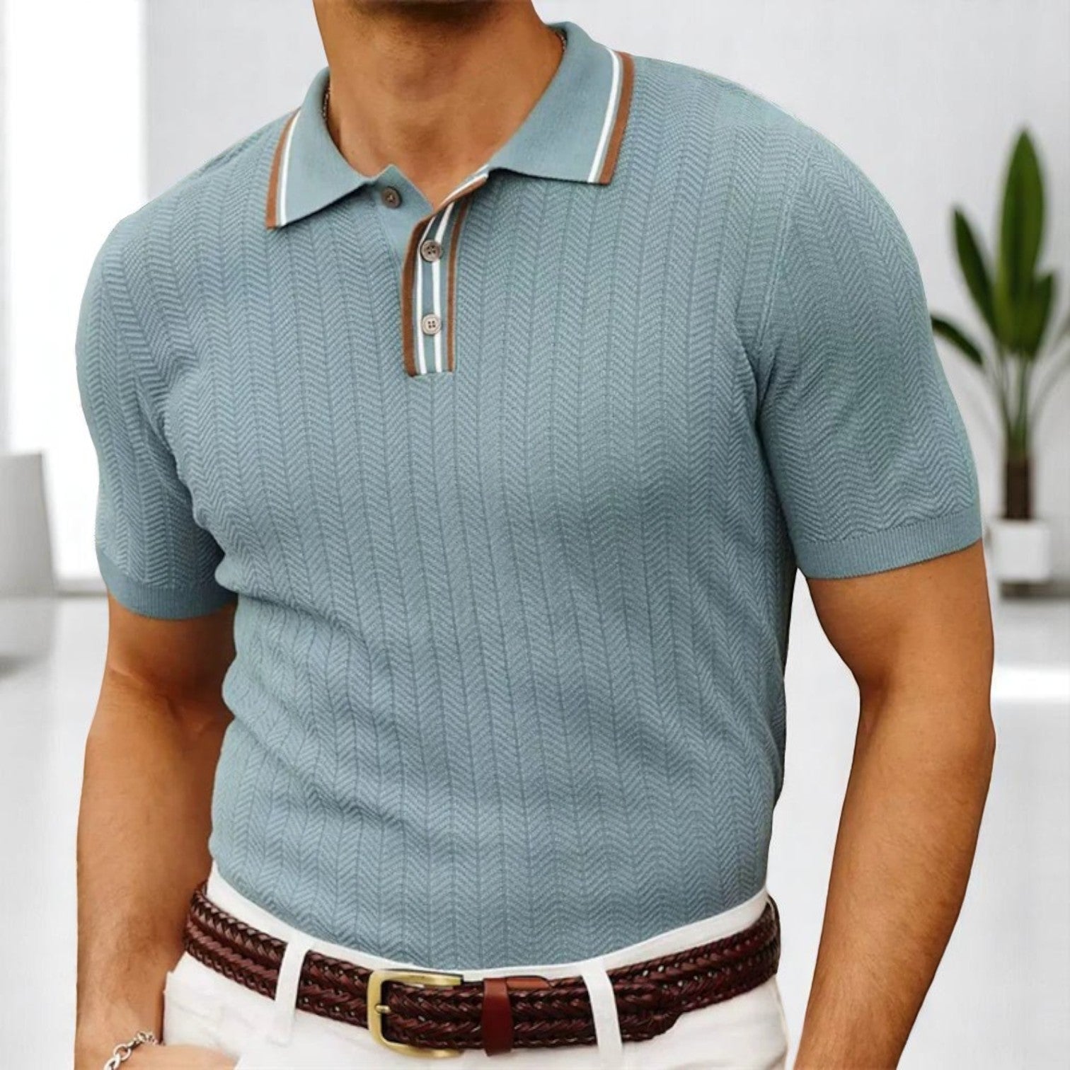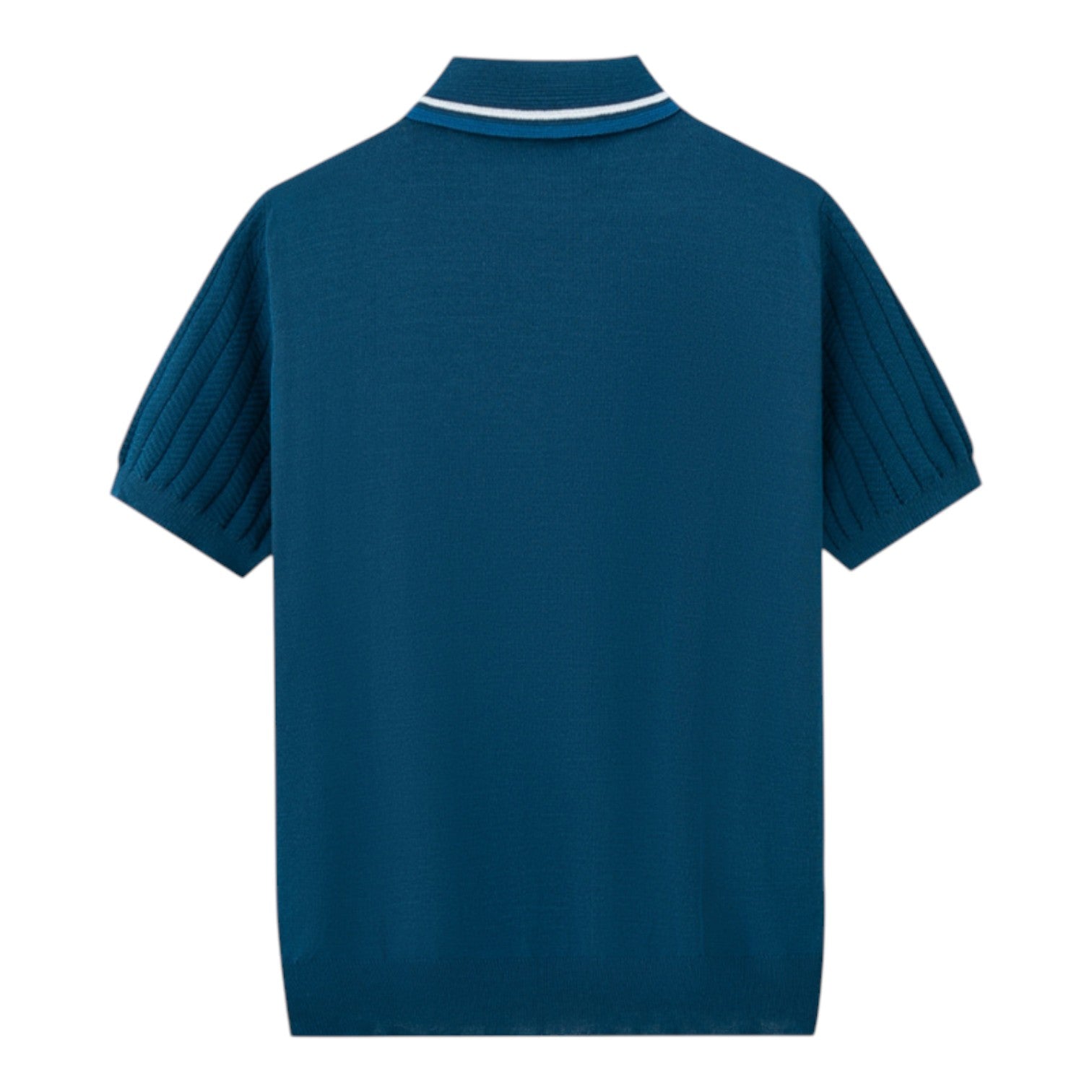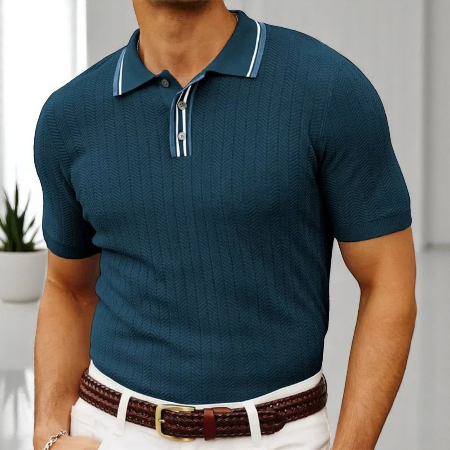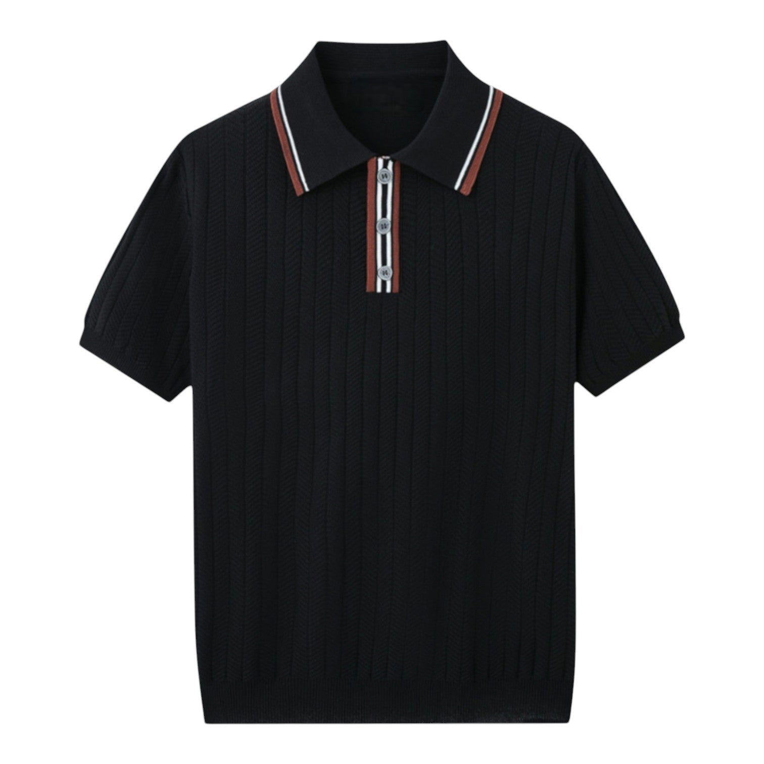 Glæsileg prjónuð pólópeysa úr mjúkri viskósu með náttúrulegri teygju. Hún er með áferðarmynstri, andstæðum kraga og hreinum þriggja hnappa klaufa — fullkomin fyrir hlýja daga úti, afslappað kvöld eða hvað sem er þar á milli.